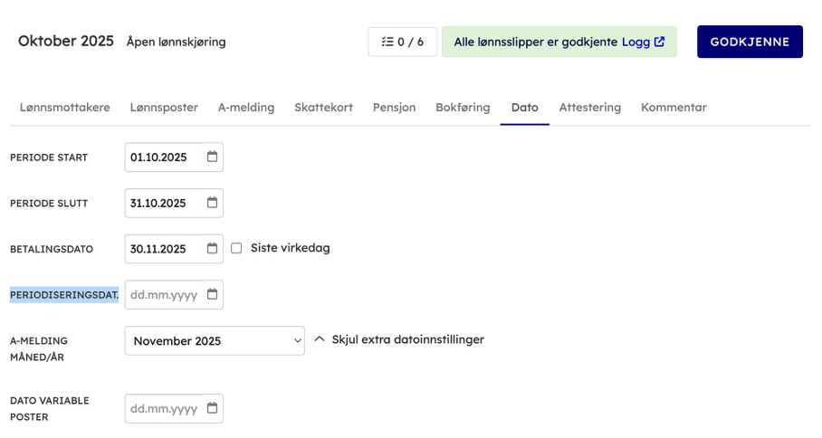 Med samlet periodisering så vil lønnskostnaden periodiseres til periodiseringsdatoen via dato-fanen på lønnskjøringen.