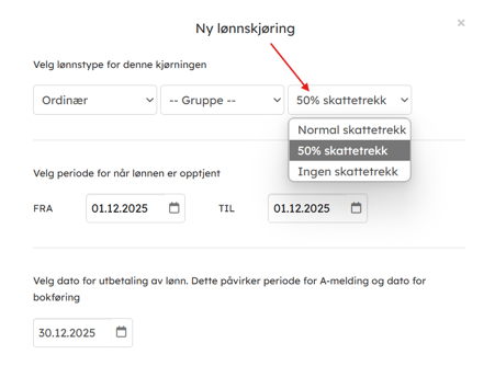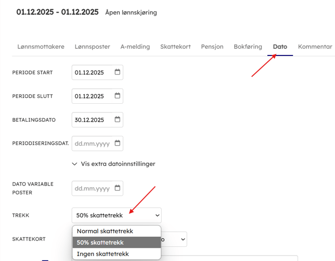 - NB: Dersom du allerede har en åpen lønnskjøring det skal være halv skatt på kan du gå inn på lønnskjøringen -> fanen "Dato" og endre skattetrekk der.