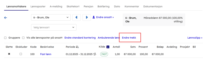 - Dersom du ønsker å overstyre skattetrekk pr. ansatt kan dette gjøres ved å trykke deg inn på den ansatte det gjelder. Trykk deretter endre skattetrekk.