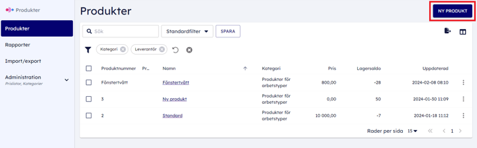 För att skapa en ny produkt måste du klicka på knappen "Ny produkt" högst upp till höger i Produktmodulen