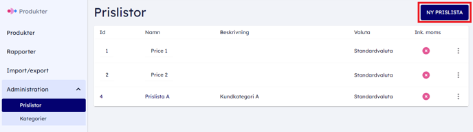 - För att använda prislistor måste man först skapa en ny prislista. Detta görs genom att gå till produktmodulen > Administration > Prislistor och sedan klicka på "Ny prislista".